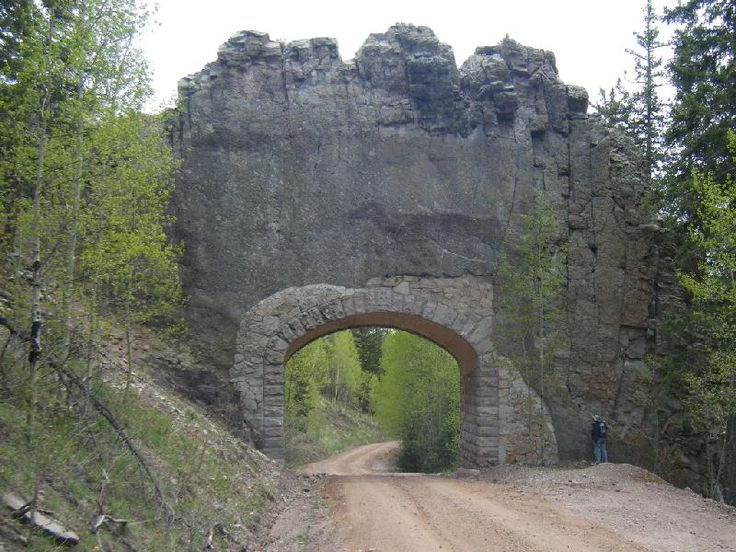 This dramatic arch was formed when lava filled a crack in the rock and hardened. Over time, surrounding rock eroded away, leaving behind this striking volcanic feature perched above a quiet dirt road in southern Colorado.