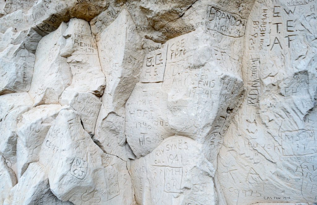 Travelers on the Oregon Trail carved their names directly into this soft sandstone cliff, leaving behind a literal sign-in sheet of westward migration. The markings are still visible today, preserved by generations of landowners.